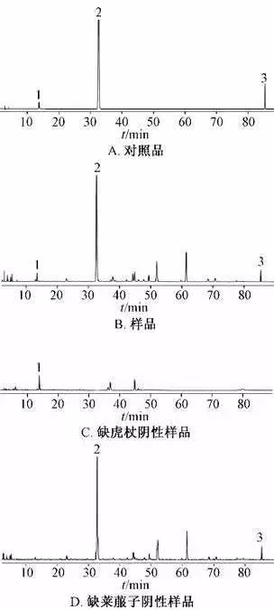由图可知, 样品溶液与对照品在相应位置上有相同保留时间色谱峰, 阴性无干扰