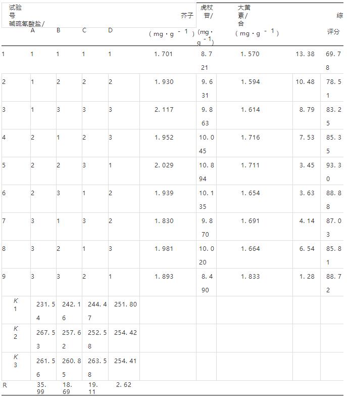 2.2.11 含有量测定 取表 1 正交试验设计所得的样品,按 “2. 2. 3” 项下方法制备供试品溶液, 在“2. 2. 1” 项色谱条件下测定,计算含有量